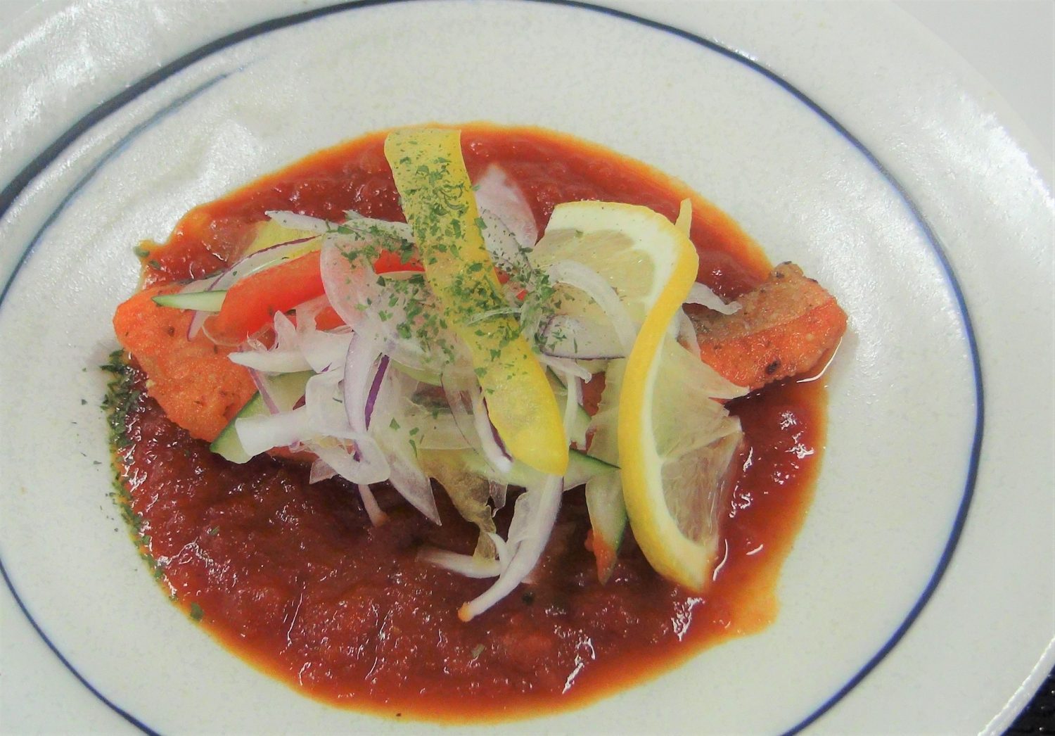 銀鮭はお造りのほかにも焼き物(ムニエル)でも登場。こちらは初夏らしく夏野菜のトマトをたっぷり使った鮮やかな赤いソースを纏っています。「和食」である刺身と「洋食」であるムニエル。素材は同じ鮭でも料理の仕方によって食感も旨みも異なり食べていて楽しくなりました。