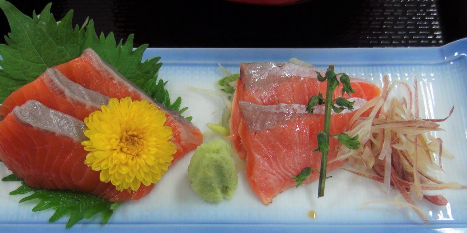 6月のメイン食材は南三陸で旬を迎えている「銀鮭」です。南三陸は銀鮭養殖に国内で初めて成功した地域であり、南三陸で養殖された銀鮭は宮城のブランド鮭として高く評価されています。養殖の鮭は天然物と違って寄生虫の心配がない為、加熱せず生の状態でも食べることが出来ます。今回の試食会ではお造り(刺身)としても登場。刺身の表面を少しあぶったものと、そのままのものと2種類。両方とも鮭の濃厚な旨みが舌全体に広がって、思わず顔がほころんでしまいました。