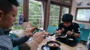 お昼休憩はレストラン神割で。皆さん楽しそうです。