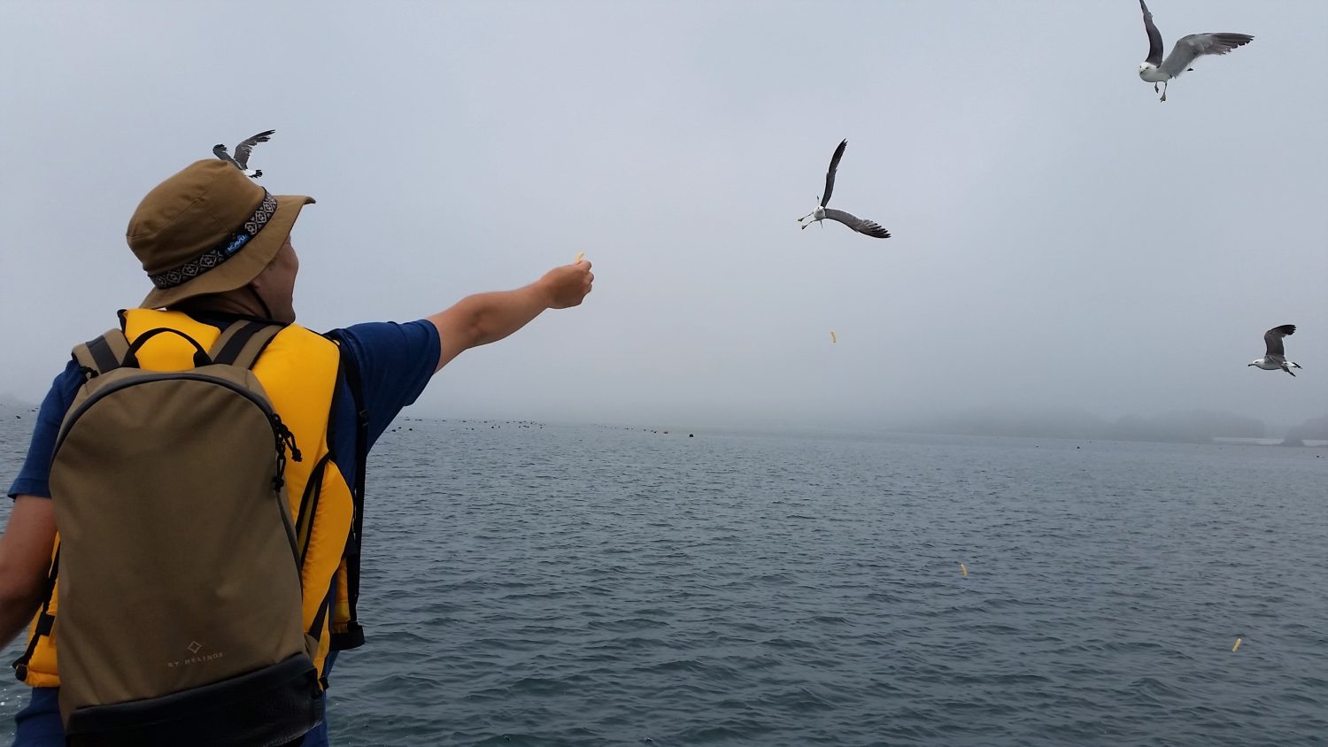 ホヤを引き揚げる場所へ向かう道すがら、追いかけてくるウミネコに、「かっぱえびせん」をプレゼント(?!)