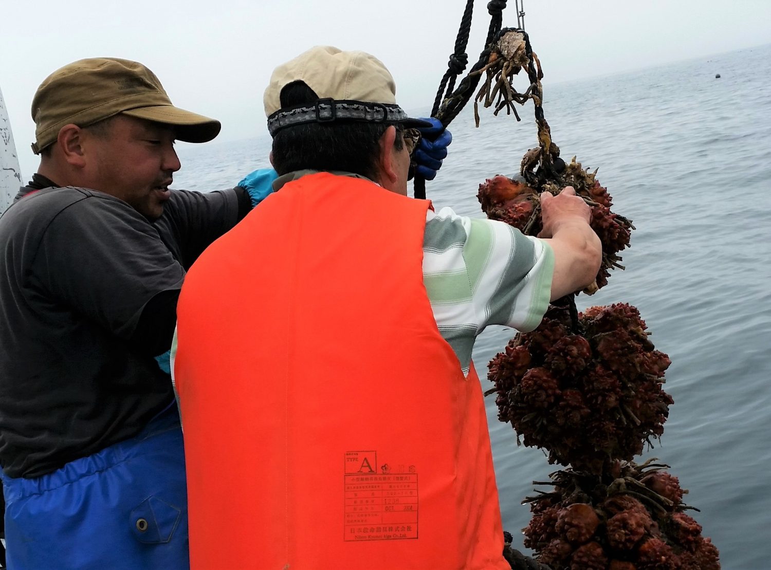 海のなかからホヤを水揚げします。