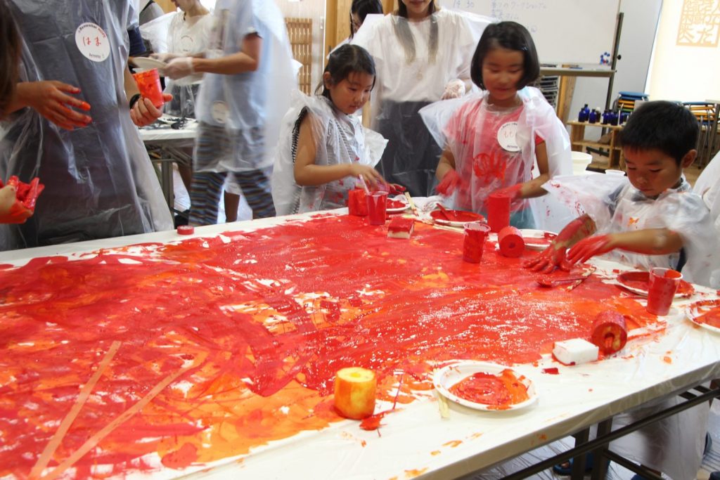 白い大きな紙に、絵の具や、クレヨン、スポンジを使って