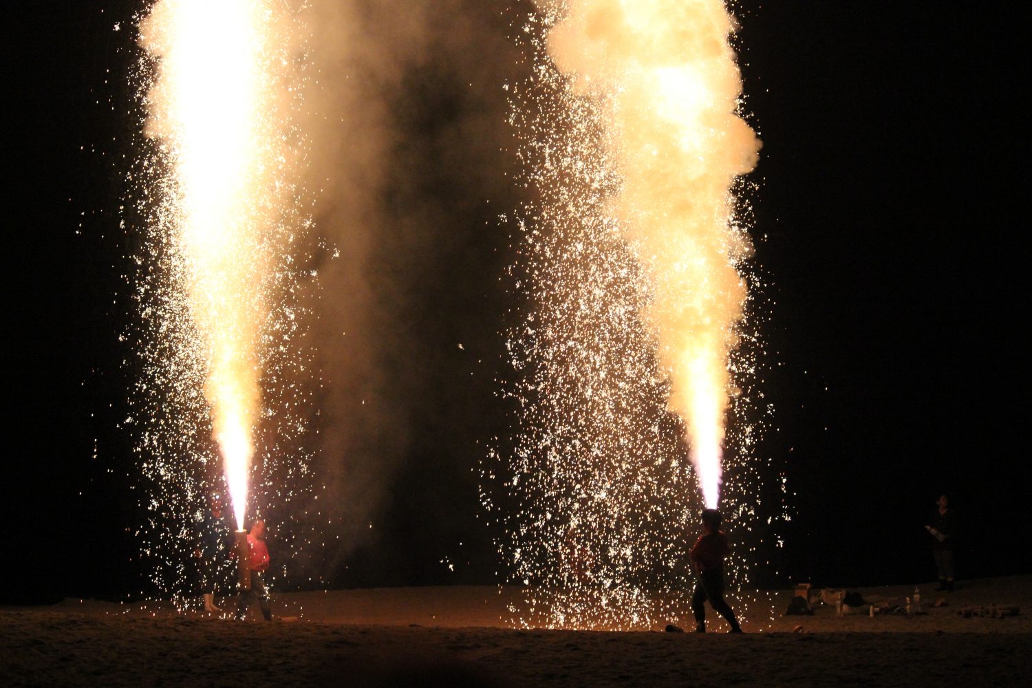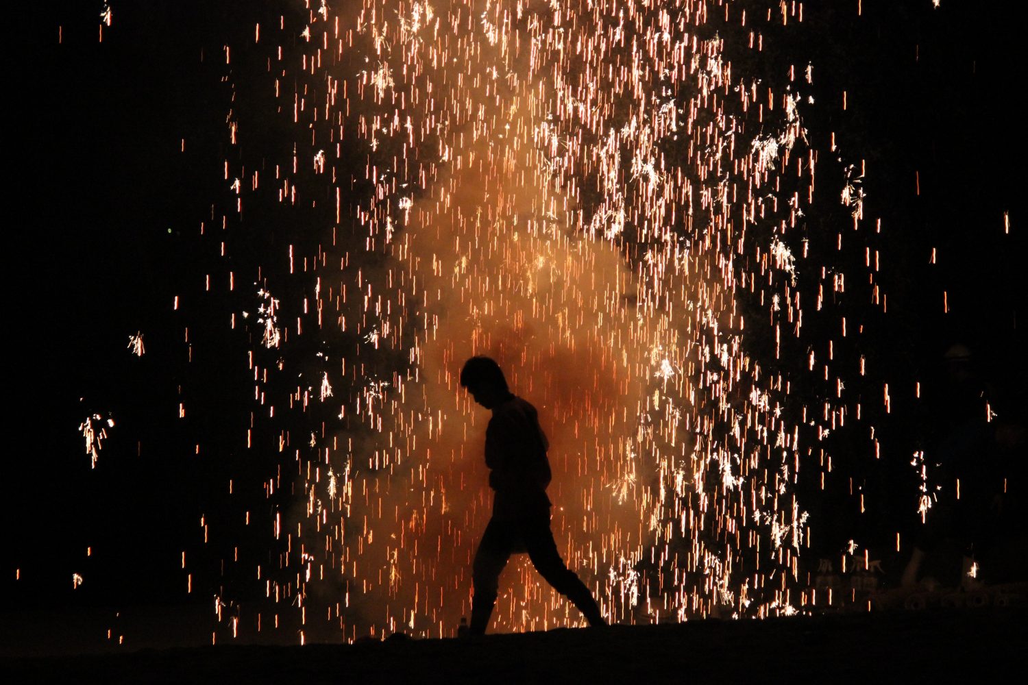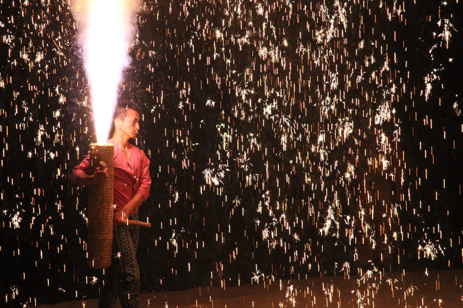 手筒花火(てづつはなび)は、1メートルほどの竹筒に火薬を詰め、それを人が抱えながら行う花火で、巨大な火柱を噴出させます。