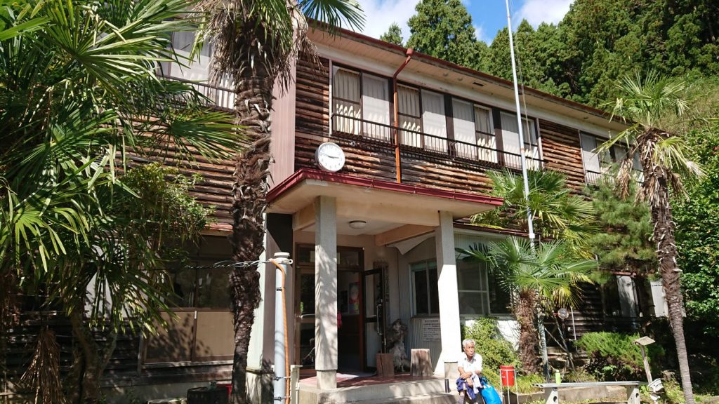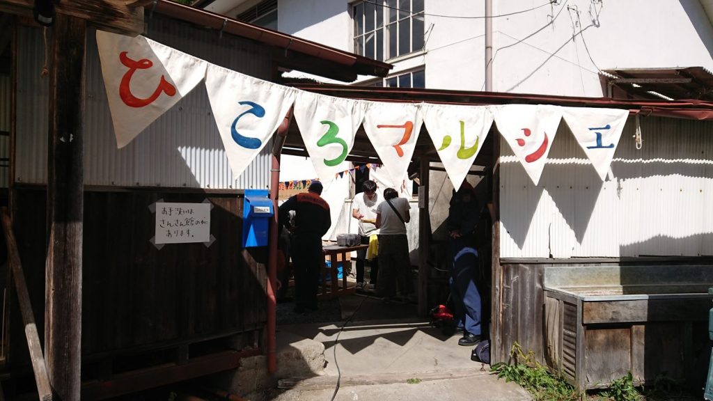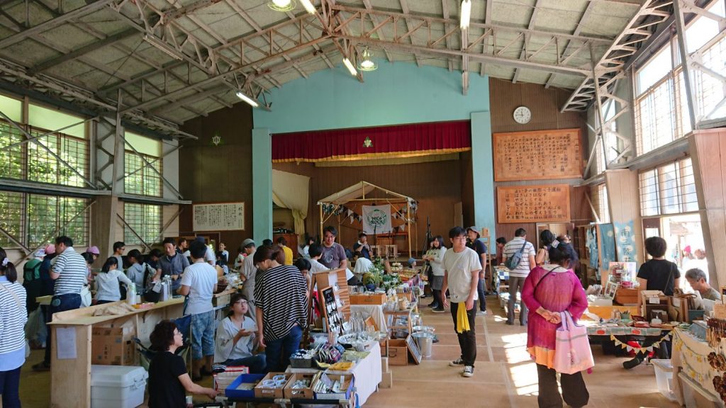 当初、ひころの里で開催予定だったひころマルシェは台風25号の影響で会場は変更に。昔学校だった建物を現在宿泊施設として活用しているさんさん館に移動してイベントは始まりました。