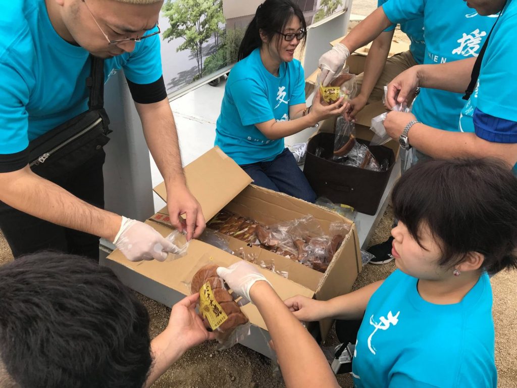 その待っている方々と近隣住民の方にバナナ焼きとタオルを渡すと同時に