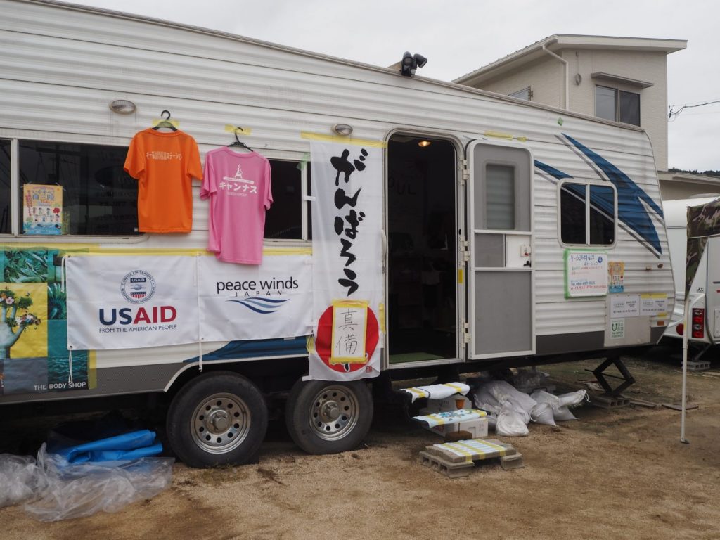 このトレーラーハウスでは全国から寄せられた真備町への物資をあつめ、