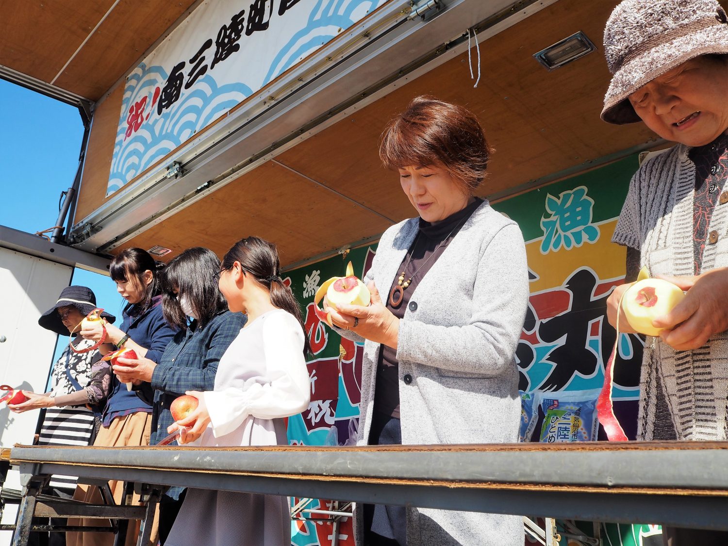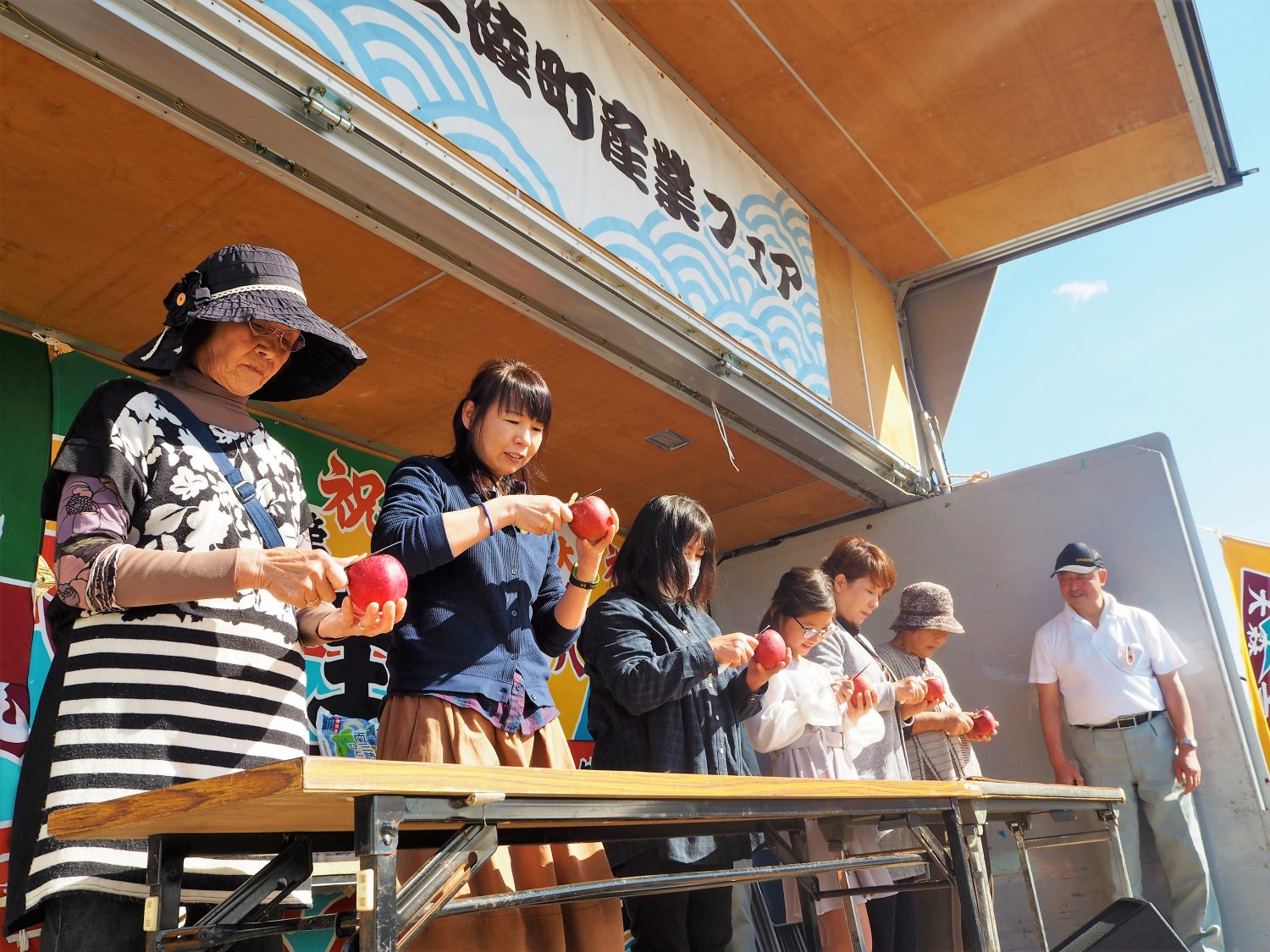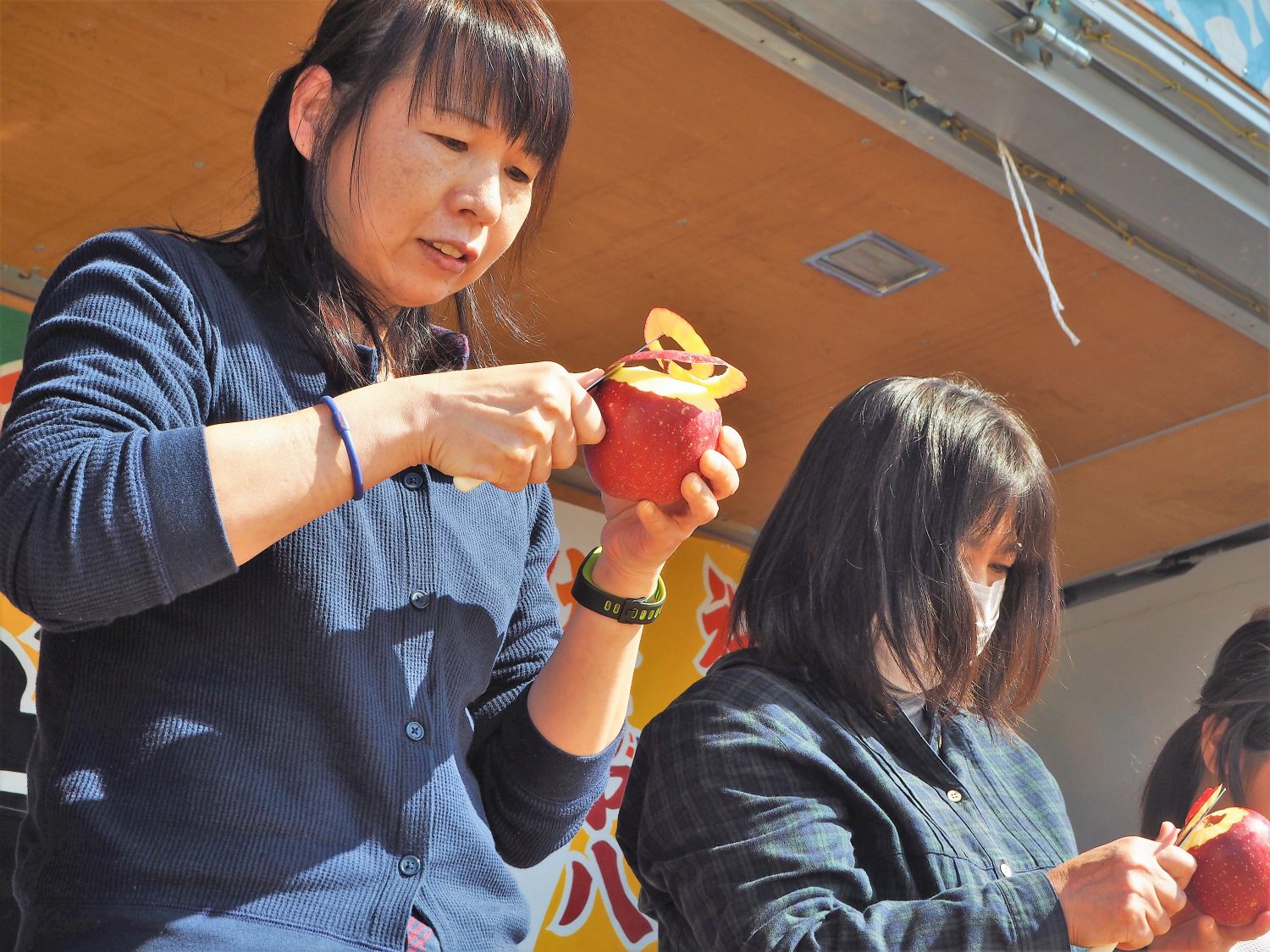 このリンゴの皮むき大会はどれだけ長く皮むきをできるか、を勝負します。