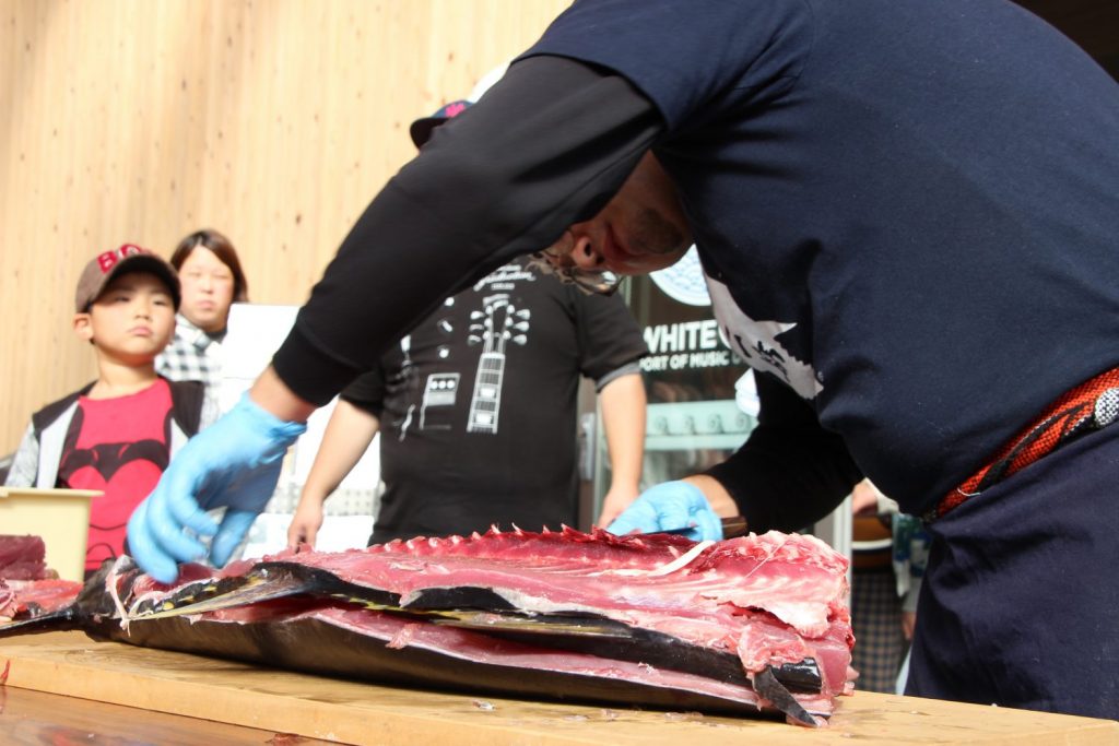 その場で捌かれて、頂くマグロはうまい!!解体ショーも迫力があってとても凄かったと町内に住むお母さんは笑顔でお話をしてくれました。