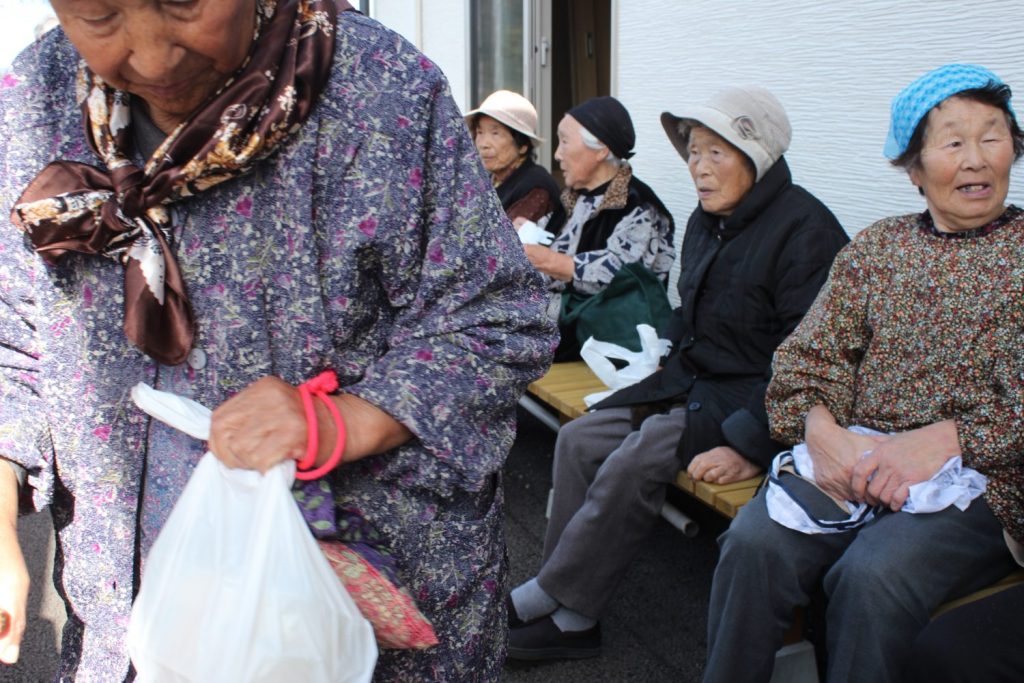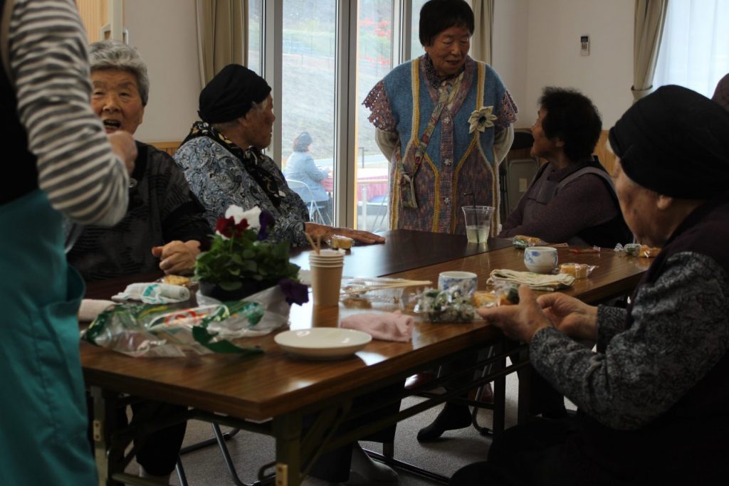 中ではおばあちゃん達が「たがい市」で購入した食べ物や飲み物や持ち寄った
