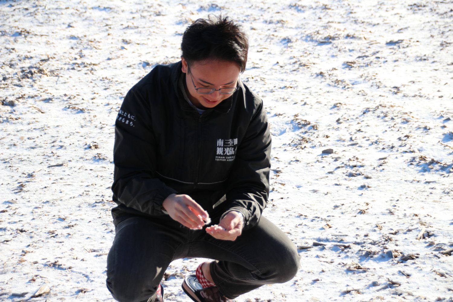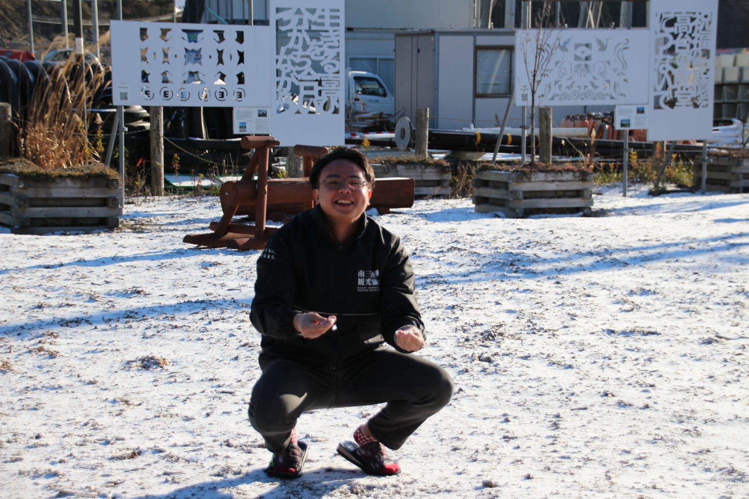 今年初の平地での積雪に、台湾人スタッフのたいよう君は大喜び!!