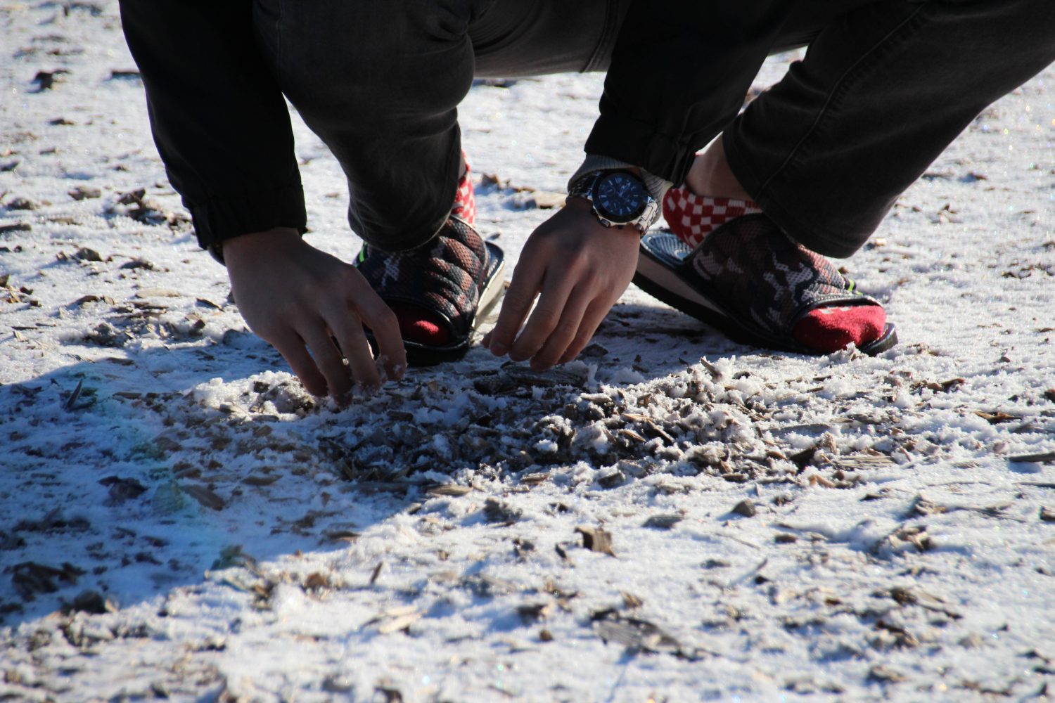慣れない雪を手ですくっています(寒そう…)。