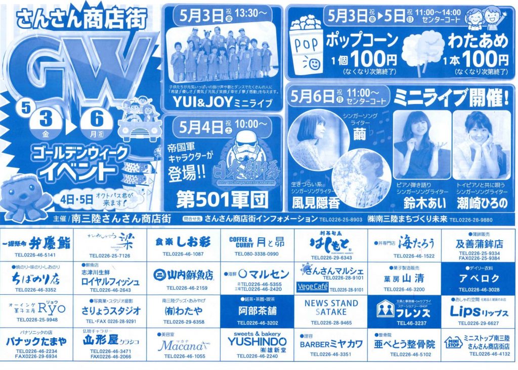 さんさん商店街 ゴールデンウィークイベントはステージイベントが盛りだくさん!!4日、5日にはオクトパス君も遊びに来てくれますよー!!詳しいイベント情報に関しては下記チラシまたはさんさん商店街HPをご覧ください。