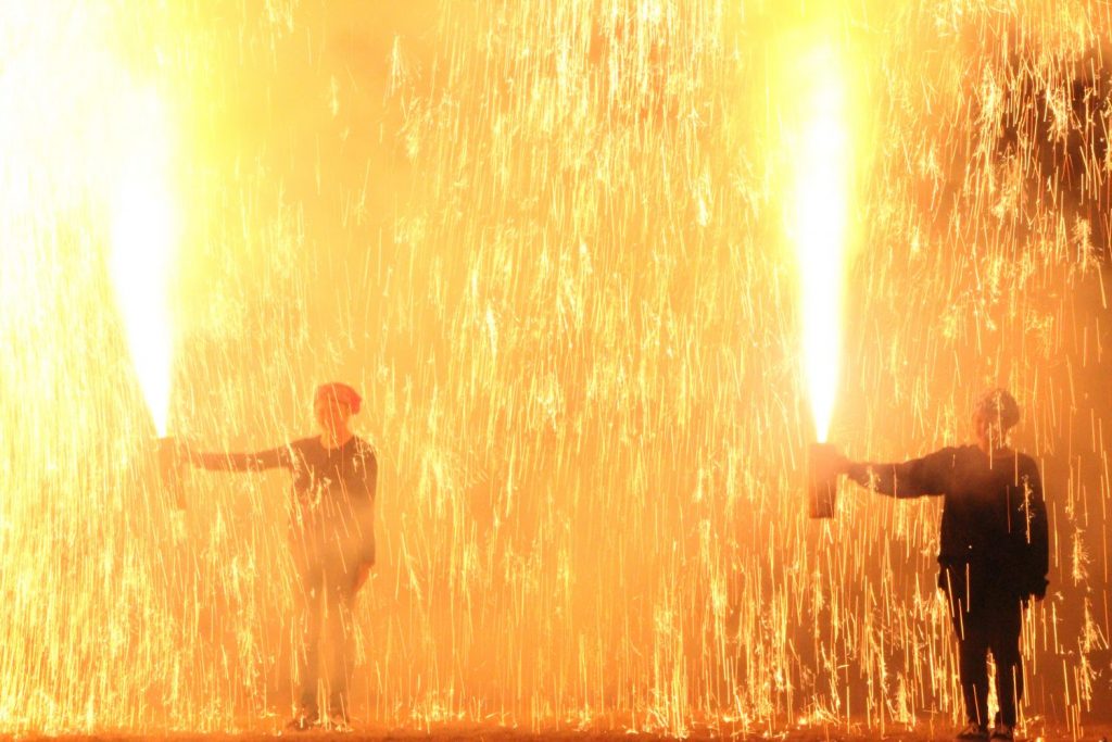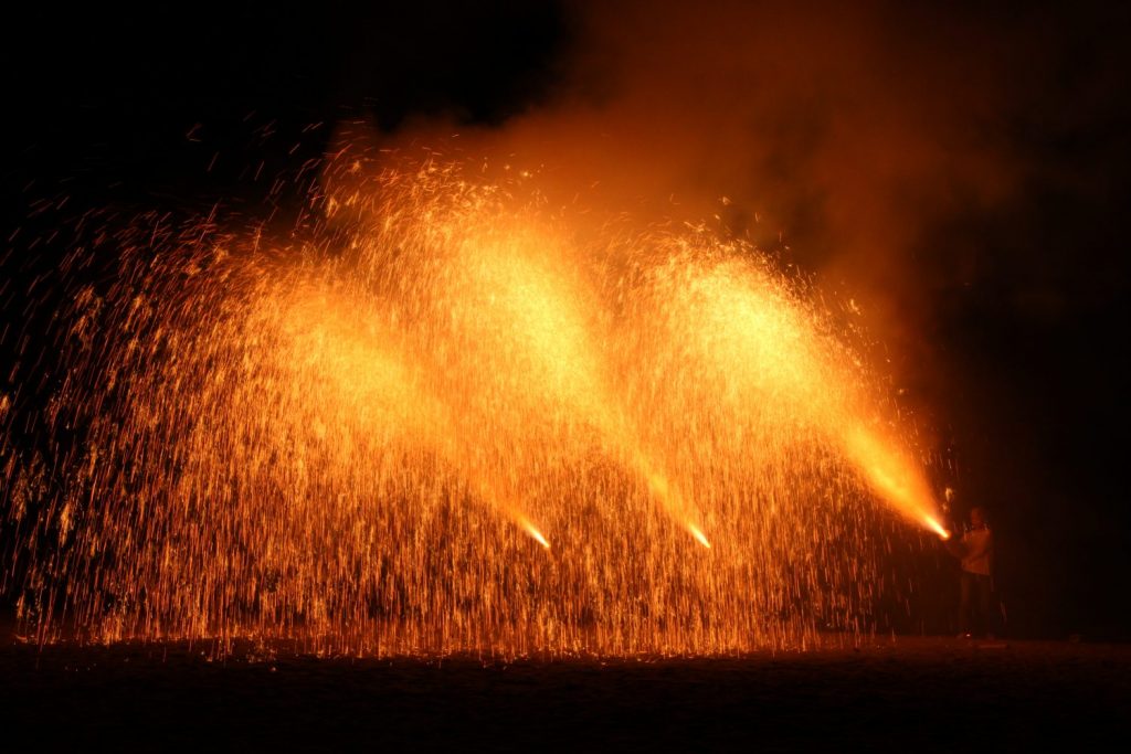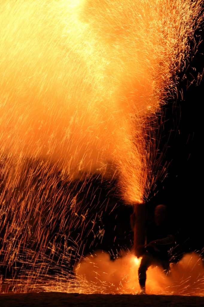 手筒花火は噴出が終わる瞬間、「ハネ粉」という火薬に火が付き,