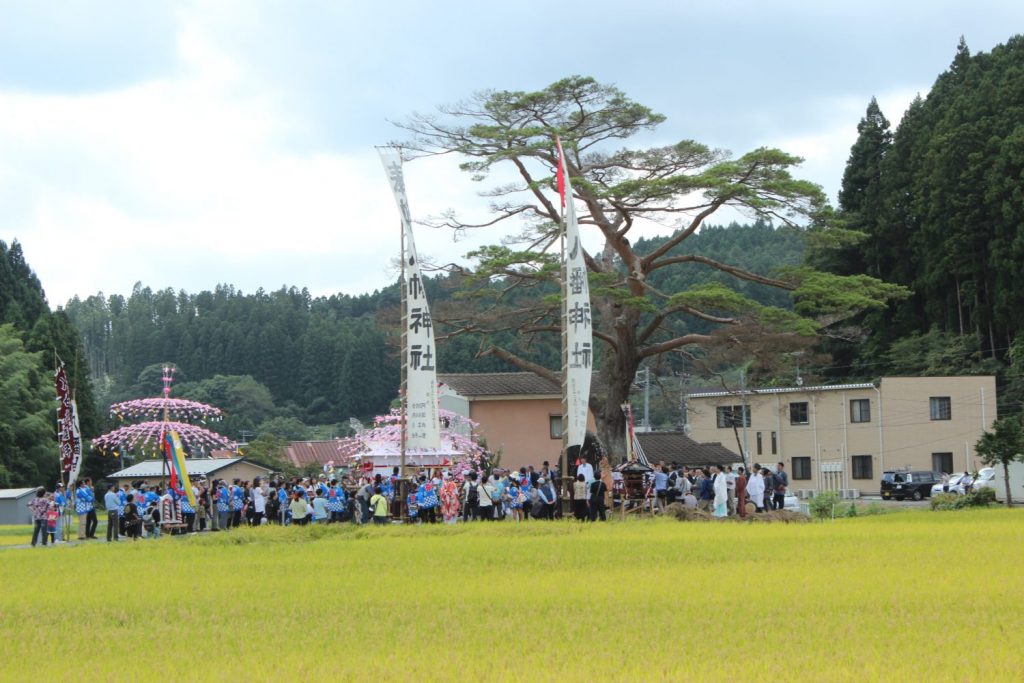 推定樹齢300年以上と言われる1本松でしたがここ数年の間に松の枯れが酷くなり今年の4月に伐採されてしまいました!がご心配なく!例年通りこの場所で神事が行われ打囃子が奉納されます。