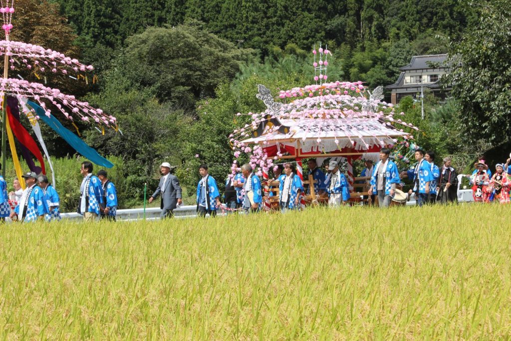 たわわに実った稲穂が黄金色に輝く田んぼ道を打囃子一行が練り歩く光景は必見です。