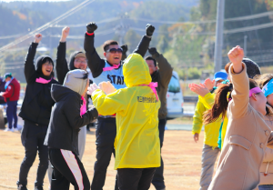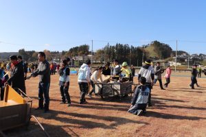 この種目は地元の高校生達が考案し、被るキャラも手作りしてくれた渾身の種目です。通常のバトンの代わりにキャラの被り物を交代していく競技で、最後の最後で白熱しました。