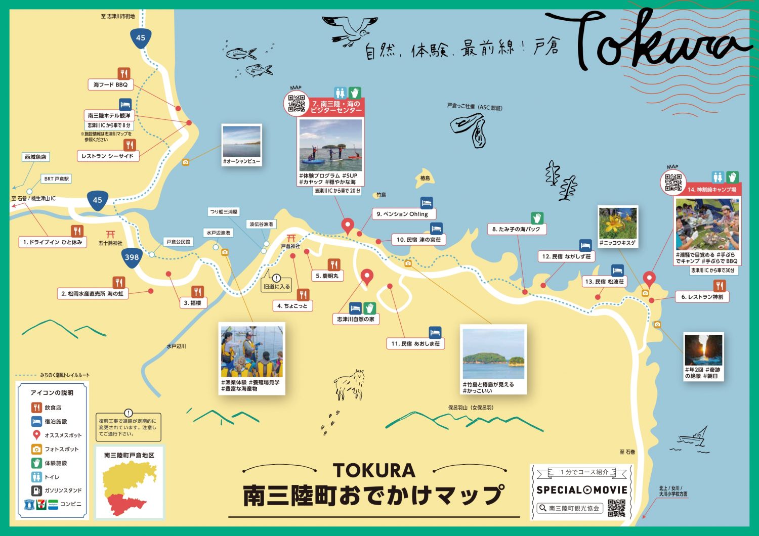 確かに魅力的&代表的なスポットですが、これらは志津川と歌津の2地区に集中しています。南三陸町はおおまかに4つの地区『歌津・志津川・戸倉・入谷』で構成されており、地区それぞれの独自の魅力が溢れているのです。