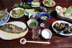 袖浜地区の『民宿なか』は豊かな自然に囲まれた、海辺にも近い民宿です。漁師であるお父さんが獲ってくる海の幸を、娘さんが腕によりをかけておもてなしして下さいます。民宿なかは、新鮮な海の幸をふんだんに使った料理が自慢です!!