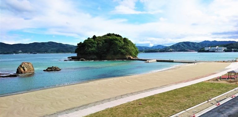砂浜の目の前の海にはモアイ像の横顔に似ている「モアイ岩」や、志津川湾に浮かぶこんもりとした緑の珠のような島「荒島(あれしま)」があります。安らかな景観は南三陸町の楽園です。