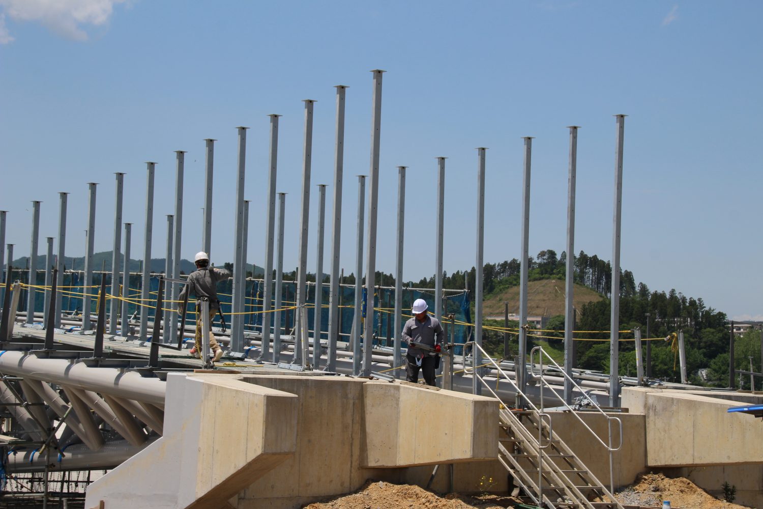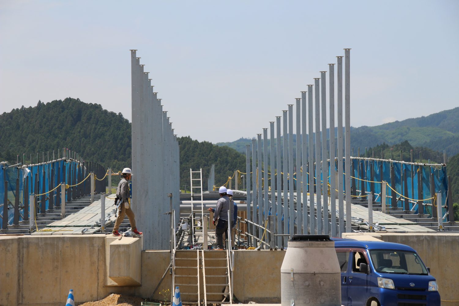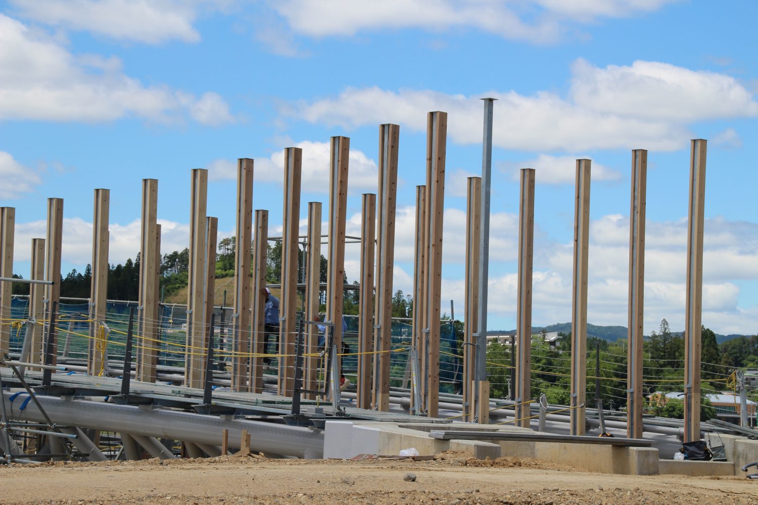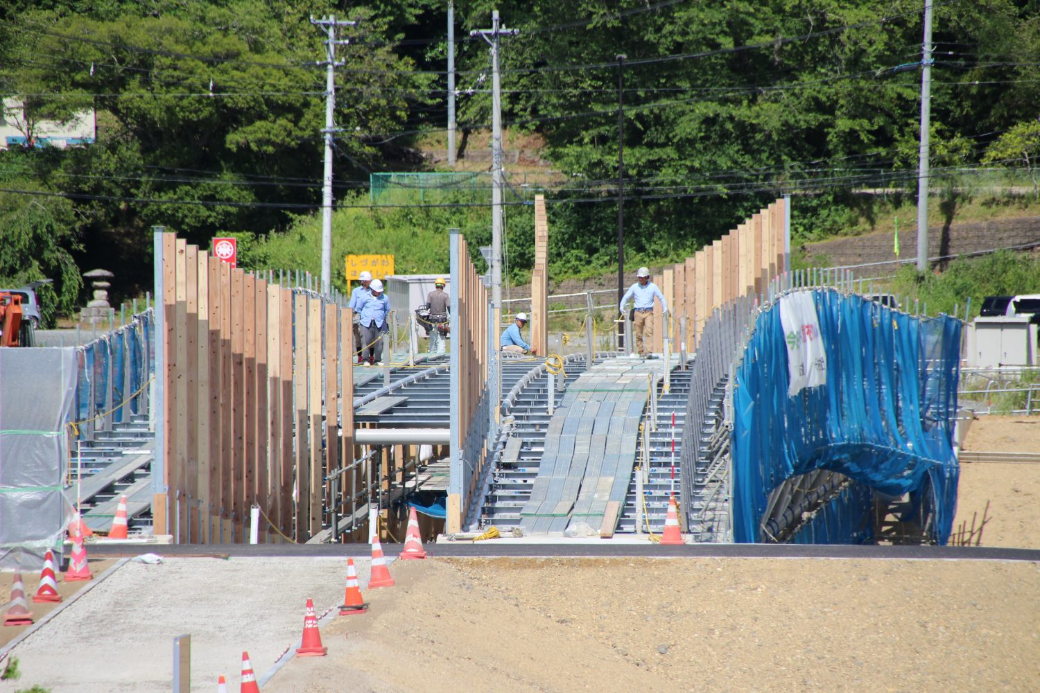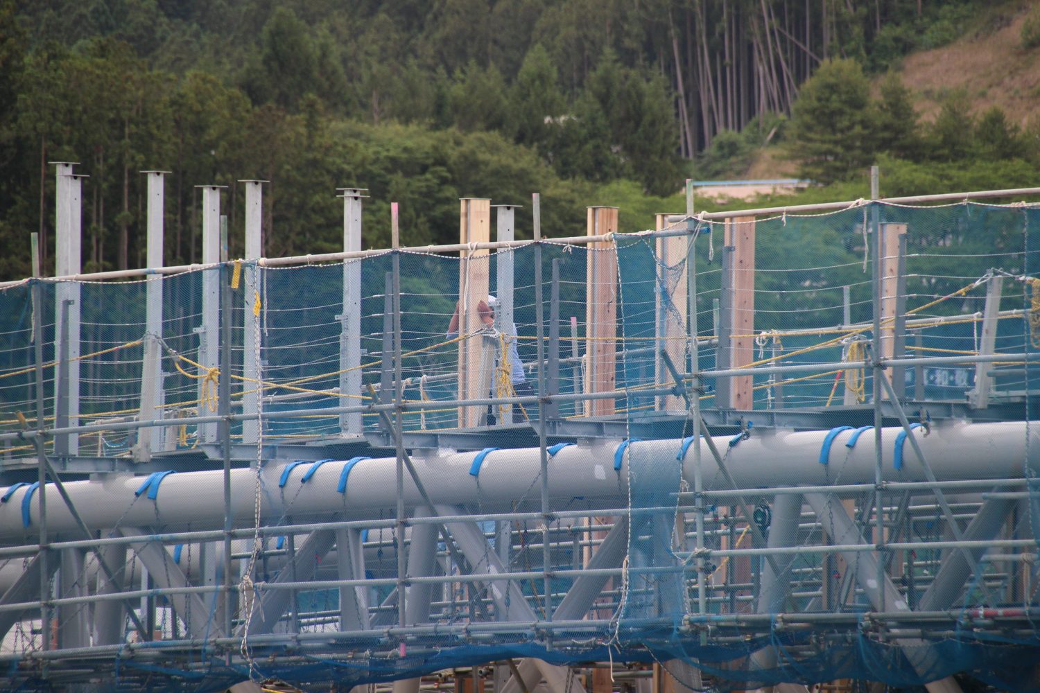 橋に接続されている鉄柱に、木材のカバーが取り付けられ始めたのです。
