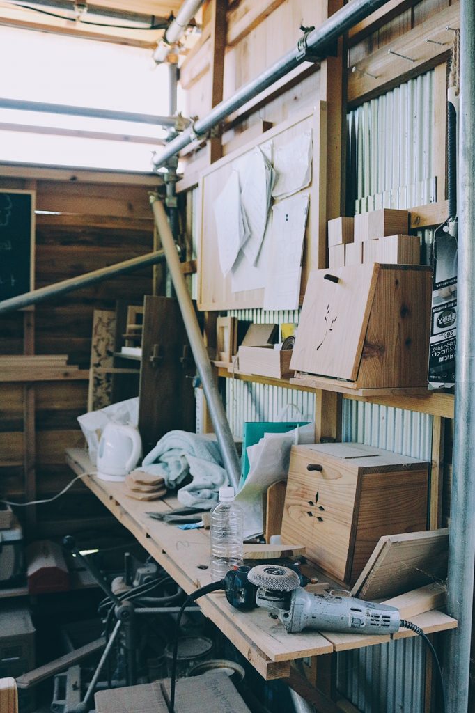 工房の中をよく見ると、棚や工具箱、ティッシュケース全て、木製のものがほとんどだった。身の回りの小物などは自分で試しに作ってみたものなどが溢れていた。