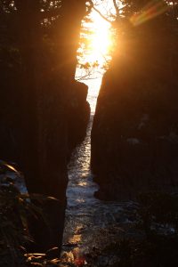 神が割ったとされる奇岩の割れ目から神々しい朝日が昇る・・・・