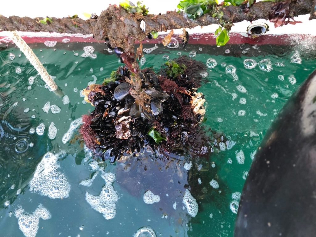 引き上げられるロープの先には殻同士くっつき株になって成長したカキが見えてきました。