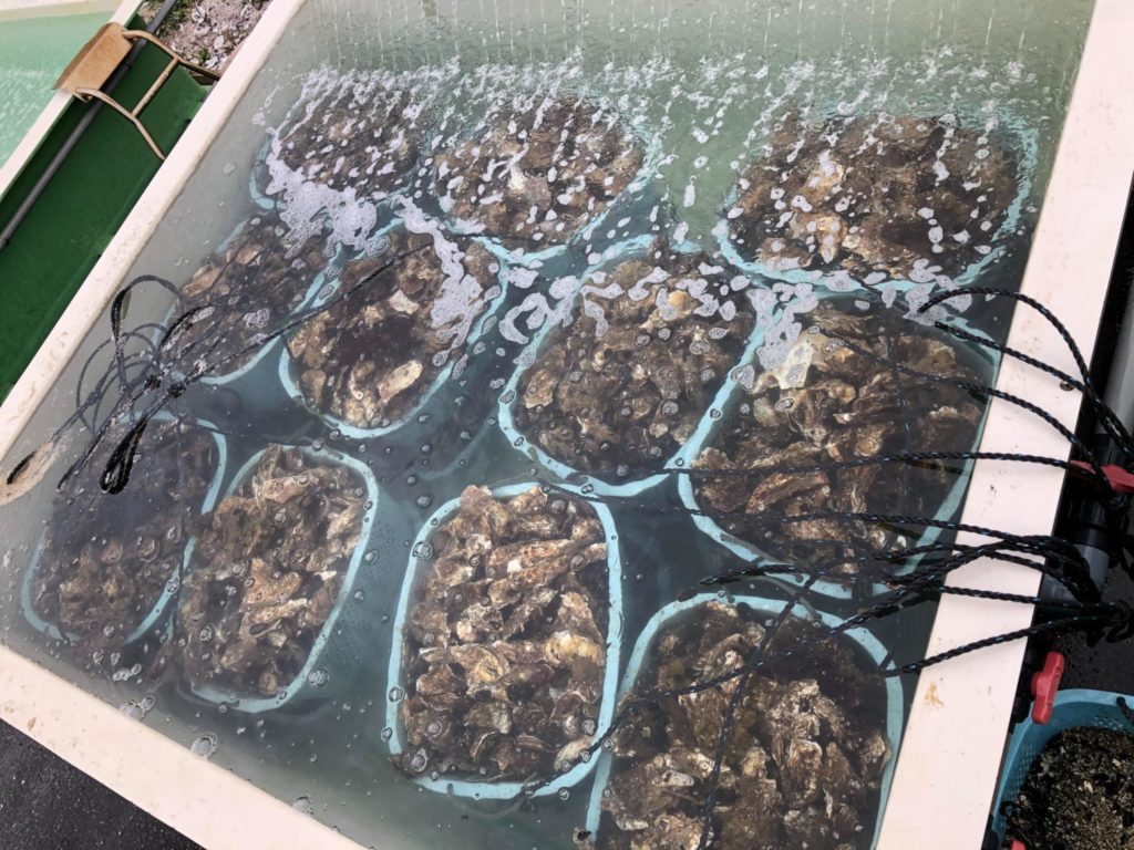 タンクに24時間つけて泥などを吐き出させキレイなカキにして加工します。