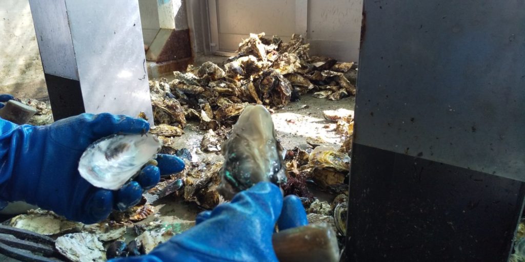 タンクから上げたカキを剥く作業は今の時期、早朝4時頃~正午頃まで続きます。