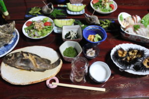 なんといっても新鮮な海の幸をふんだんに使った料理が自慢のお宿。父が海で新鮮な魚介類を水揚げし、母娘が育てたお野菜を心を込めて調理した料理が大変評判です。