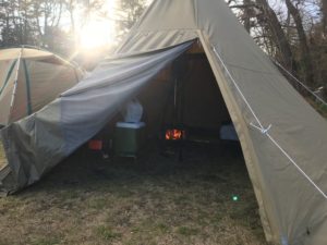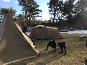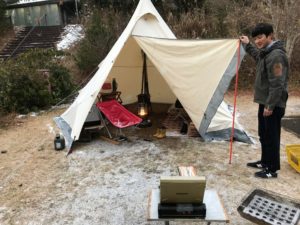 写真だけ見ると冬とは思えないキャンプシーンですね。