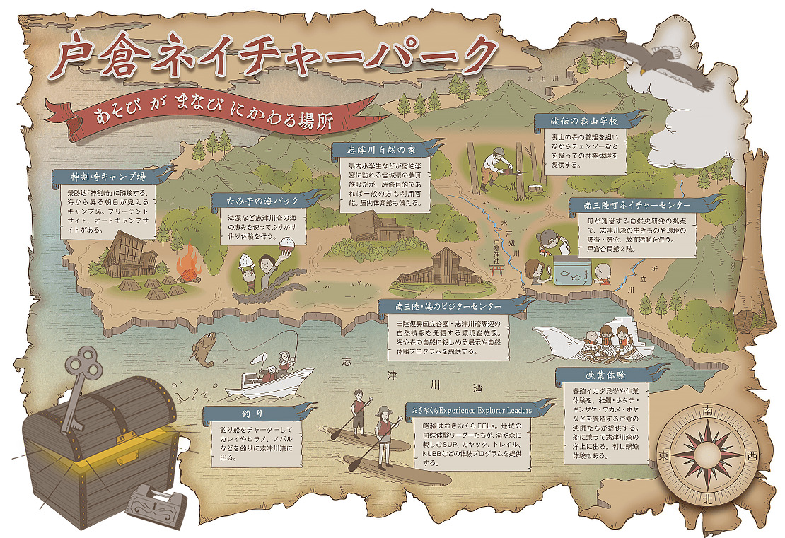 しかし、ここで唱えるパークは、南三陸町にある戸倉地域一体を自然のエリア(フィールド)に見立てて、戸倉地区の様々な施設や自然活動などに触れてもらうこと(場所)を意味しています。