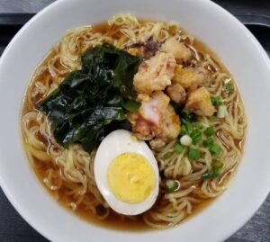醤油味のラーメンにカレー風味に味付けをした「タコの唐揚げ」を