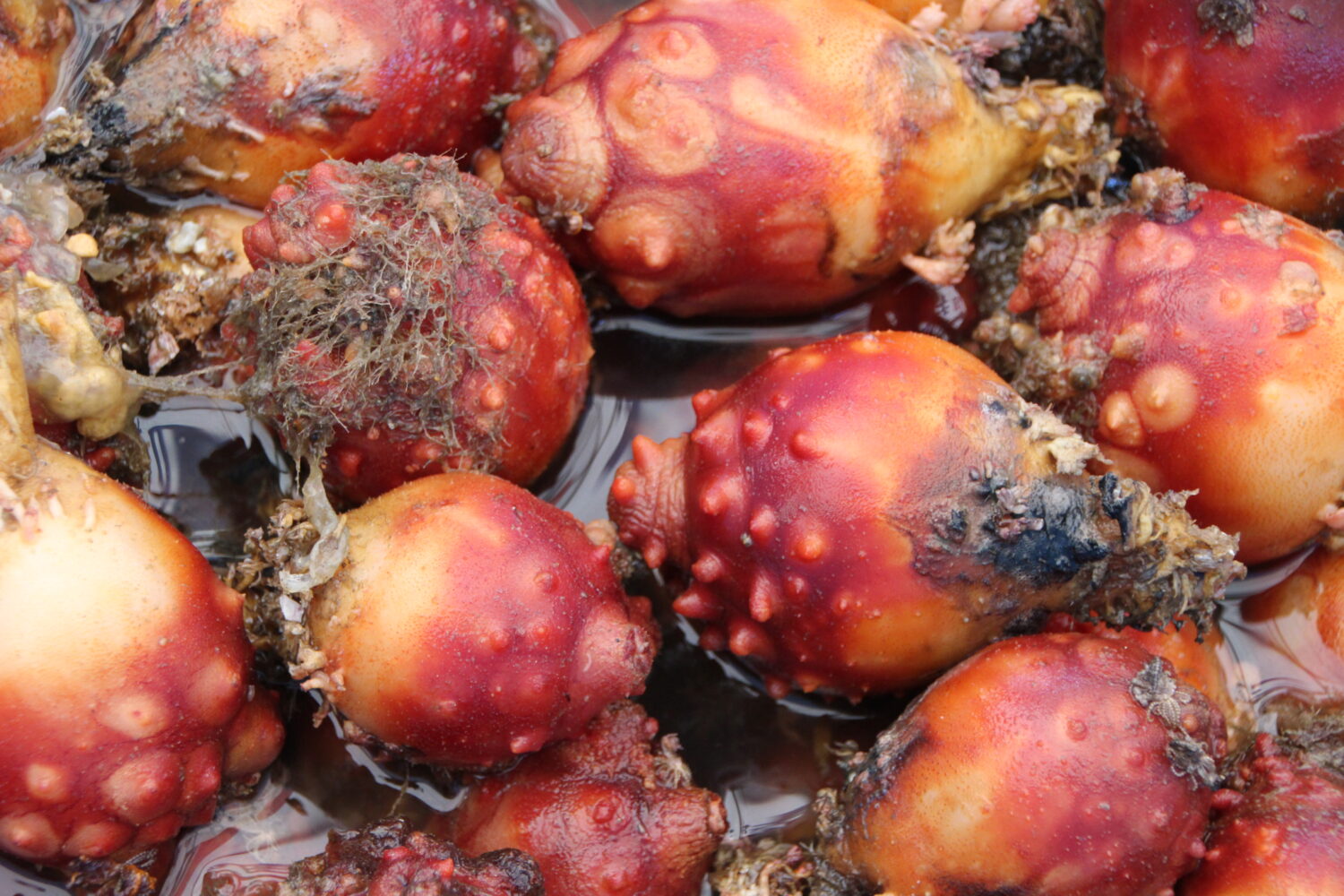 海のパイナップルの異名を持つホヤをもぎ取り収穫します。