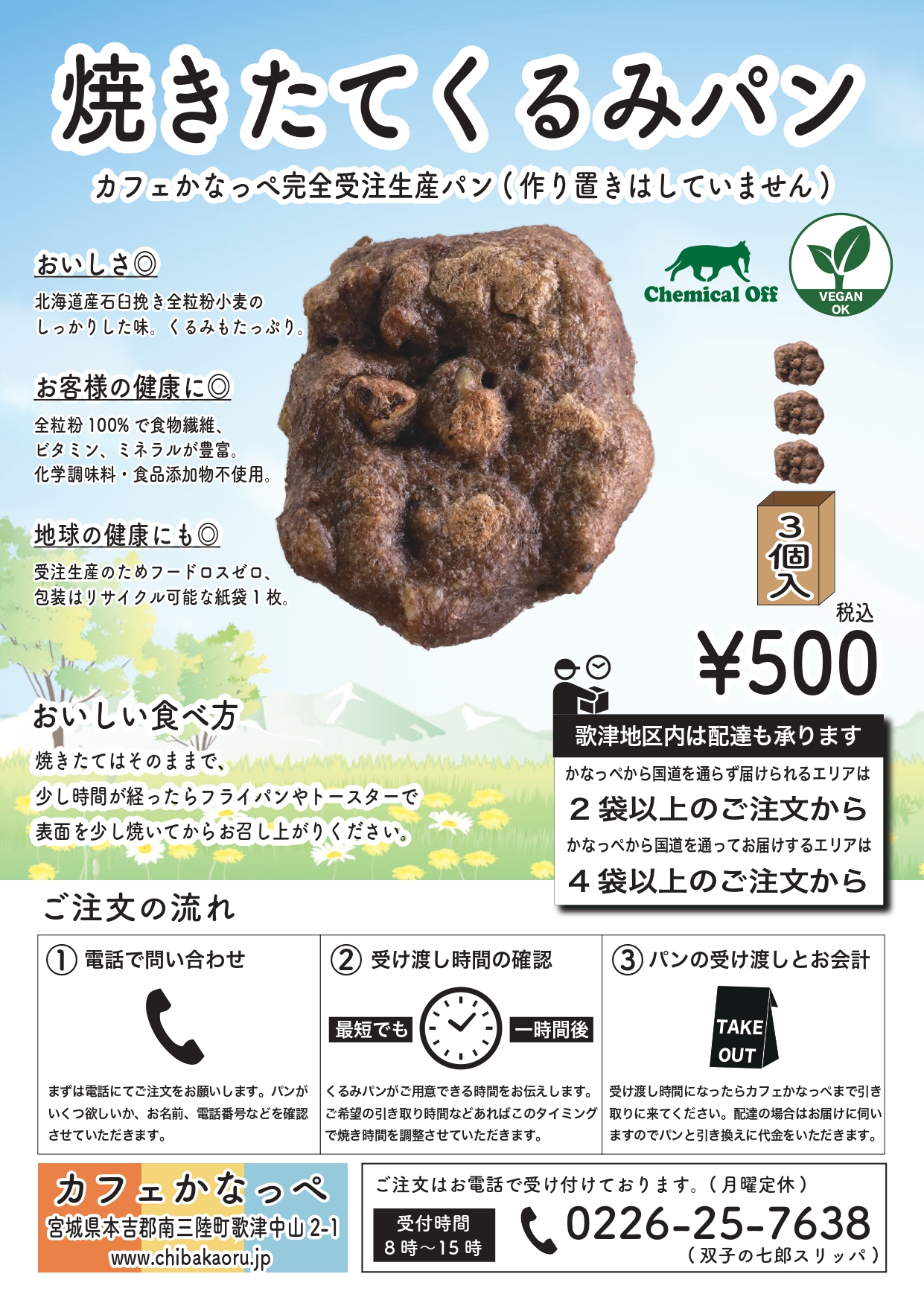 電話:0226-25-7638(受付時間:8時~15時)※最短でも1時間後の受け渡し