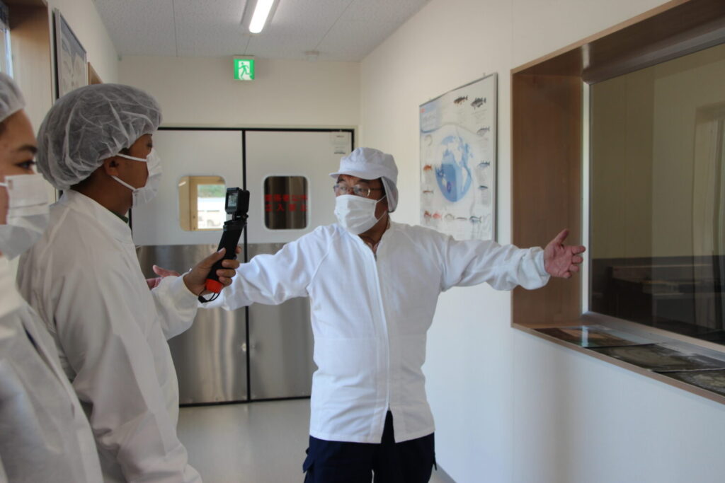 工場内は菌が入るといけないので全員帽子、白衣、なが靴を身に着け、手洗い消毒をします。かまぼこに菌が入ってはいけないので衛生面にはとっても気を使っています。工場に入る前に及川会長に工場内の説明を簡単にしていただきました。