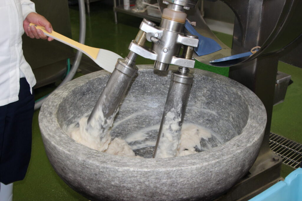 この2枚の写真に写る機械。1枚目は大きい鍋のようにも見えるし、2枚目はうすのようですね。この機械はかまぼこづくりに重要な役割をしているんですが、果たしてどんな役割があるのでしょうか。