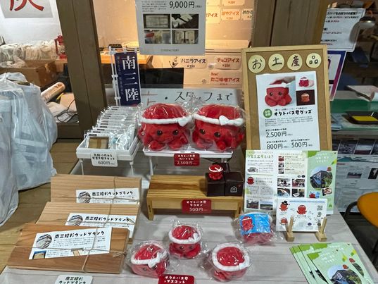 キャンプで楽しめるグッズや、オクトパス君ぬいぐるみなどをそろえてます。