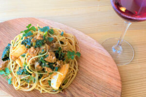 おしゃれな店内ではランチもやっていて、この時は「わかめ羊のラグーパスタ」(サラダ・スープ付き)。ワインも一緒に頂きました。帰りはバスで良かった〜。