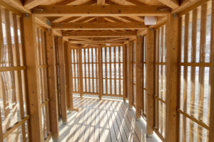 建物は木材だけを利用して建てられている伝統的な板倉構法。木の温もりをいっぱい感じられる居心地の良いお店。