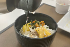 朝食も、地元の食材を使った身体に優しい健康的な御膳。こちらの特徴はお茶漬けも楽しめること!まずはそのまま御膳をいただいて、その後に好みでおかずや漬物をご飯に盛り付けて、出汁をかけてオリジナルお茶漬けが完成。二度楽しめて、美味しく大満足!