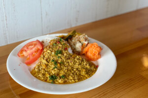 ランチは、入谷地区から車で10分ほどで行ける「Oct-VIN369(オクトヴァン)」へ。青い建物がポツンと目立ち、中に入ると素敵なカウンターの店内。ランチは本格的なカレーを頂きましたが、夜は、たこ焼きがメインの人気店。お酒の種類も豊富でついつい長居したくなる、そんな雰囲気でした!