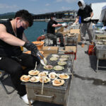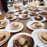 今回は、100回を祝して来て頂いた先着1000名の方に南三陸の海の幸をお振舞いさせて頂きました。蒸し牡蠣と焼きホタテ、どちらも獲れたてを来場者プレゼント。