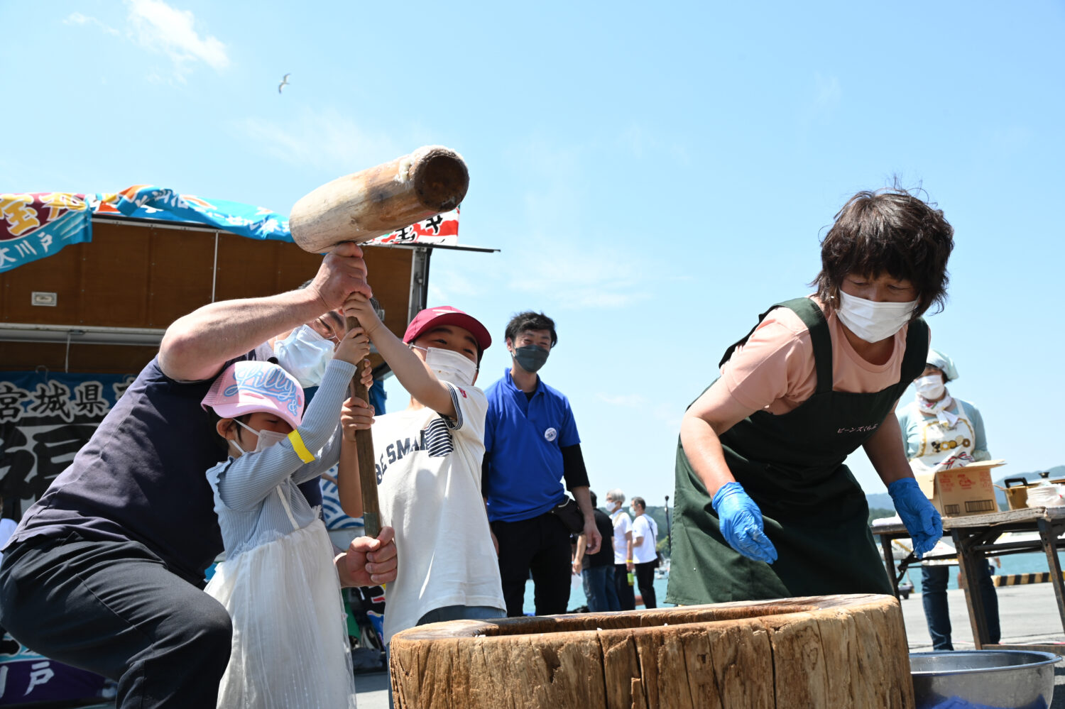 餅つきを担当したのは、南三陸町の里山エリア「入谷地区」で農業を営む女性たちが結成した「ビーンズくらぶ」の阿部恵美子さん。