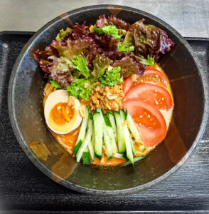 豆乳を使った女性に嬉しい響きのメニュー。濃厚な豆乳とごまのスープに、ピリ辛の肉味噌と夏野菜がよく合う冷やし豆乳担々麺。こちら以外にも、サラダ中華(税込880円)も販売中。サラダとラーメンが組み合わさった一品。しっかりと野菜摂取が出来て女性も満足◎。