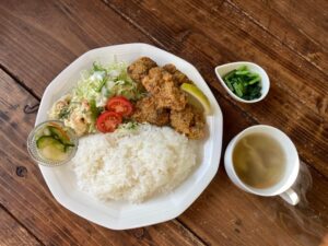 南三陸町戸倉地区波伝谷(はでんや)や入谷地区の木材を使用した温かみのある店内。Aランチは日替わりで、Bランチは週替わりで提供しています。