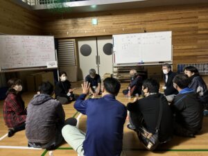 最後は、災害のシチュエーションを1泊した後、「自然災害が発生した時、どんなことが起きるか、起きた場合にどんな対応が必要か、どんな備えが災害が起きる前にできるだろう」とチームで考えていきます。1日を通して見えてきた世界が変わった参加者の人々は、改めてどんなことが必要か考え言語化できる時間になったようです。