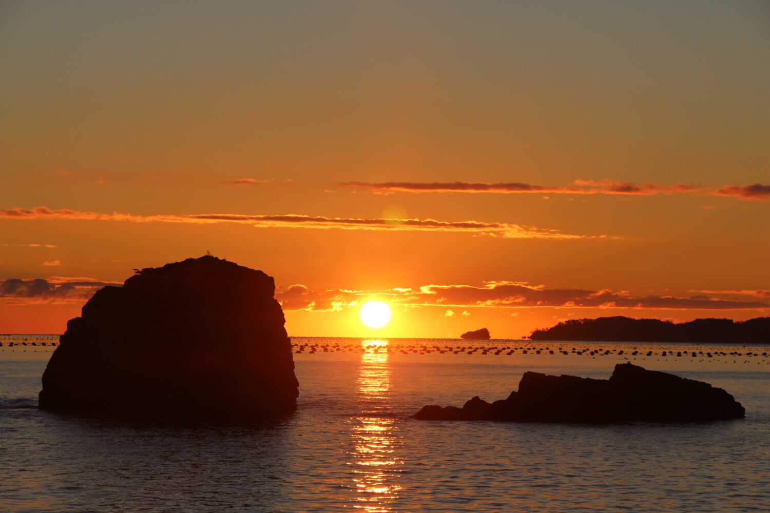 モアイの横顔に見える事から「モアイ岩」の名前で親しまれている海に浮かんで見える岩と、もう1つの岩の間から綺麗に日の出があがってくる様子が拝めます。