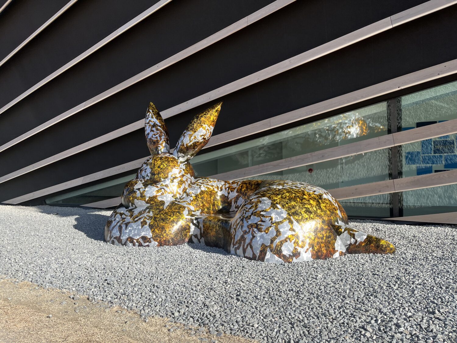 東北の⾵景の中に住む⽣き物の図像を纏ったうさぎの彫刻。南三陸町の⾵景を育んできた⽣き物たちの再⽣を願っています。鑑賞者はうさぎに座ることもできます。外構に設置され、震災伝承館の訪問者を迎える彫刻作品となっています。