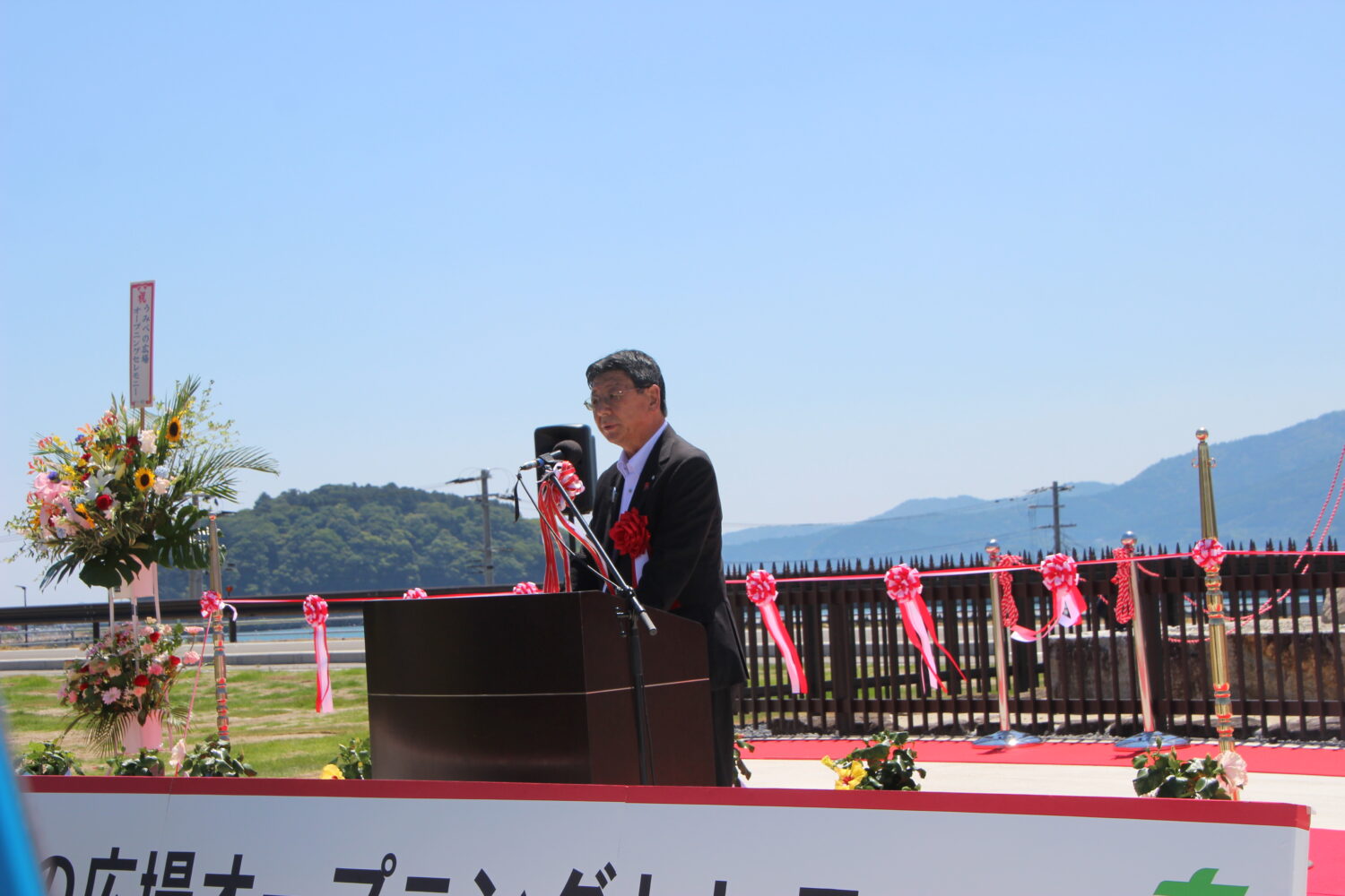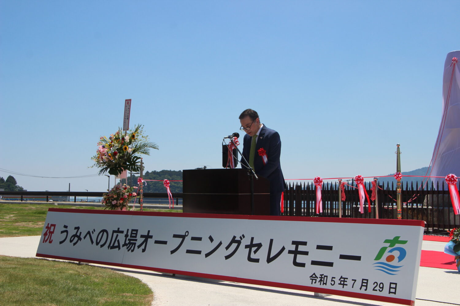 元三菱商事株式会社会長であり、ラテンアメリカ協会長の佐々木さんが震災後にモアイ像を発見してくれたことや、モアイプロジェクトを推進してくださったこと、南三陸高校の生徒がモアイで南三陸を盛り上げようと実施した取り組み、震災後に寄付を募り町にモアイバスを寄付してくれたことを振り返りながら、今「みなさんと共に、新しくできたうみべの広場とモアイ像を大事にしながら、大いにこの広場で楽しんでいただきたい」と語りました。